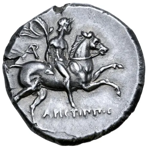 | Descripción del anverso | Nude rider on horseback to right, holding filleted palm; monogram to left, ΑΡΙCΤΙΠΠΟC below. |