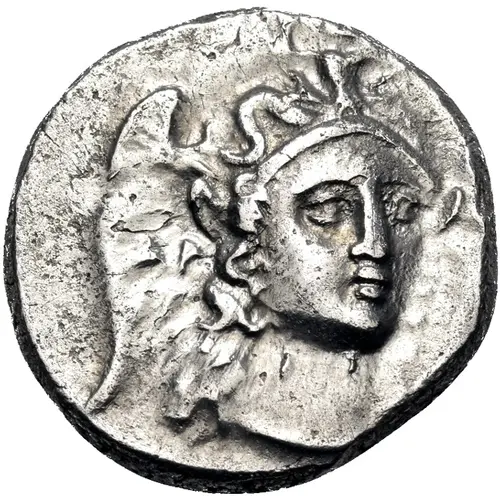 | Obverse description | Three-quarter facing head of Athena, turned slightly to right, wearing triple crested helmet adorned with Skylla; to left, AP/IΓ. |