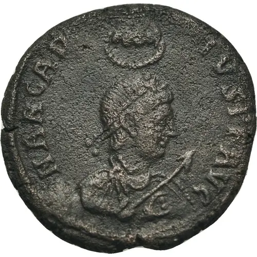 Pearl-diademed, draped and cuirassed bust right, holding spear and shield, Hand of God above holding wreath |