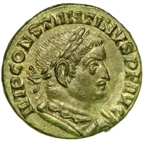 Laureate bust of Constantine on right, draped over the shoulder, seen from three-quarters forward. |