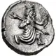 | Descrizione del rovescio | Persian king, wearing kidaris and kandys, in kneeling-running stance right, holding spear in right hand, bow in left; barley grain to left. |