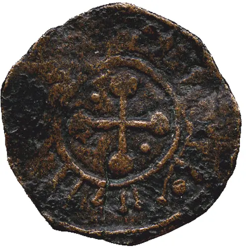 Description de l’avers Cross with pellets at the ends and a pellet in the first and fourth angles.