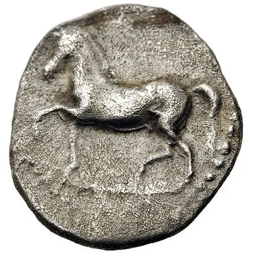Technical/Grading: This silver obol, weighing 0.9 grams and measuring 13 millimeters, represents a challenging piece to strike fully. High-points for preservation would include the central features of the primary device, such as a horse's mane or a deity's facial details, and any discernible legend. Due to the small flan size, off-center strikes and incomplete details are common technical characteristics. A well-centered strike with full rendering of the main design elements and minimal die wear would be highly prized, reflecting superior minting effort for such a diminutive yet important denomination.