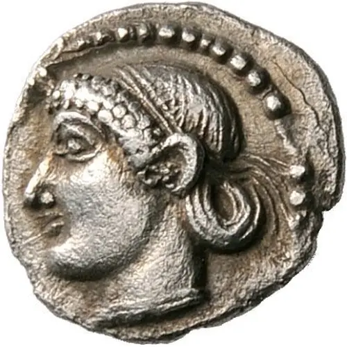 | Obverse description | Head of the nymph Larissa to left, with ribbon and with her hair bound at the back |