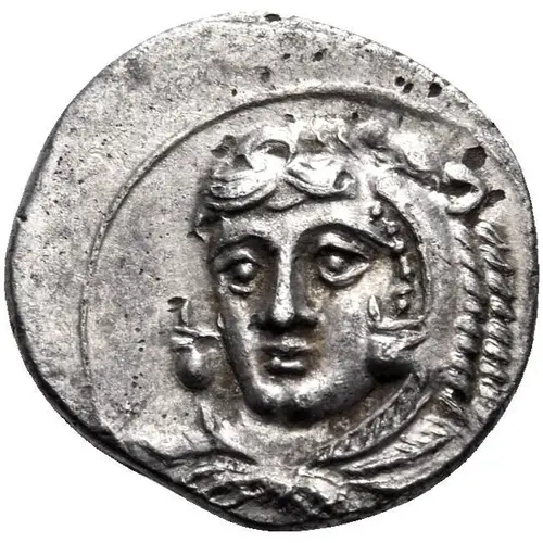 | Reverse description | Female head (Hera? Tyche?) to left, wearing a turreted crown ornamented with two discs and and an acanthus leaf, an earring with three pendants, and a pearl necklace. |