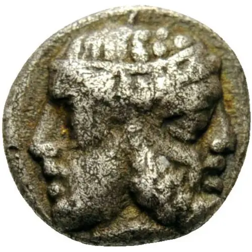 | 表面の説明 | Janiform head of Hera, on left, and Zeus, on right |