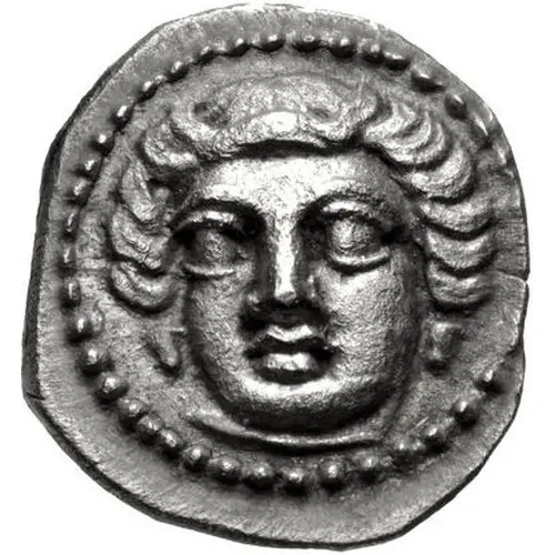 背面描述 Head of Aphrodite left, wearing ornate stephanos, single-pendant earring, and necklace.