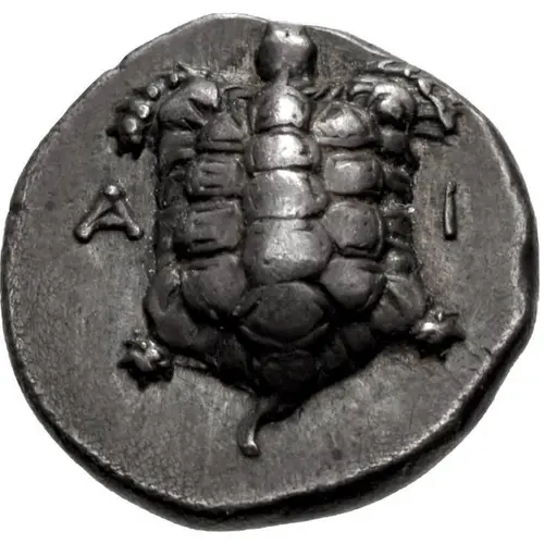 | توضیحات روی سکه | Land tortoise with segmented shell; A-I flanking. |