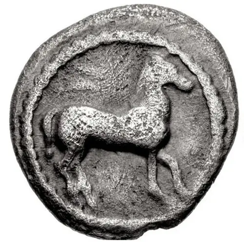 | Descripción del anverso | Free horse standing facing right, within border of dots |