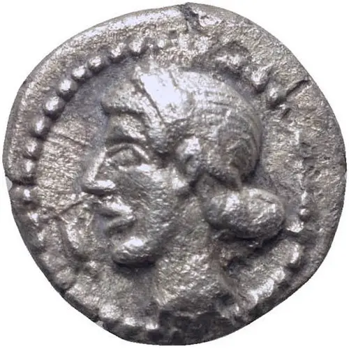 | Obverse description | Head of nymph Larissa left, her hair bound with a ribbon and tied at the back; border of dots. |