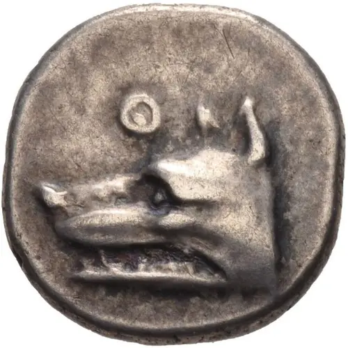 | Obverse description | Head of wolf left; Ө above. |