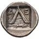 | Reverse description | Large A; Δ-E across upper field, thunderbolt below; all within incuse square. |