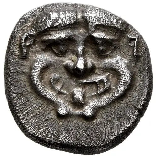 | Mô tả mặt trước | Facing gorgoneion with protruding tongue. |