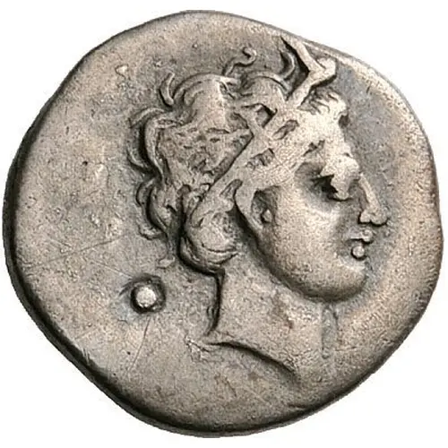 | 表面の説明 | Youthful head to right (Apollo or a nymph?), with short, wavy hair and wearing diadem. Behind his head a pellet |