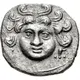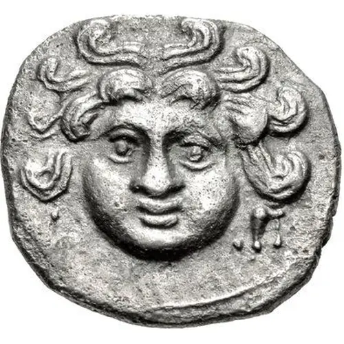 | Obverse description | Gorgoneion facing, wearing triple-pendant earrings. |