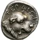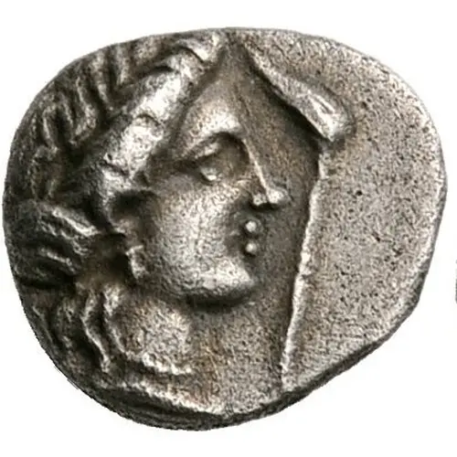 | Aversbeschreibung | Head of Ennodia to right, wearing pendant earring and necklace. Before her to right, a flaming torch |