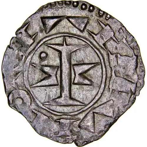 | Obverse description | Cross composed of a fess and two standards (or mitres), confined to the 1 of a bezant. Degenerated legenda around. |