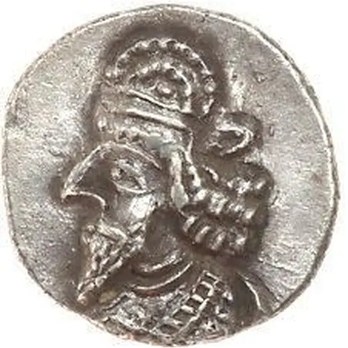 | Aversbeschreibung | Bearded bust of Kapat left, wearing diadem with one loop tie and Parthian-style tiara with two rows of pellets around pellet, no border. |