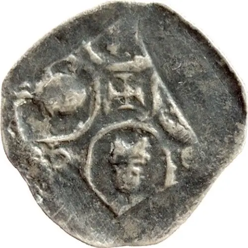 | 裏面の説明 | Three-aisled church building with three towers. In the central arch, a frontal bust of a bishop; in each of the two side arches, a star. A beaded circle on the outside. |