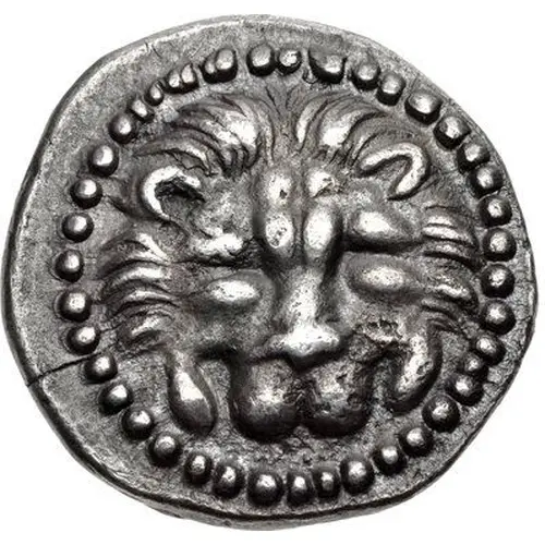 | Popis rubu | Forepart of ox right; krater to lower left, olive spray to lower right. |