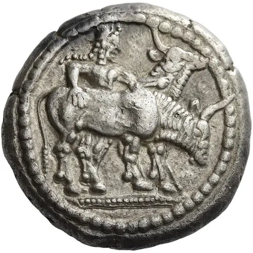 | توضیحات روی سکه | Nude herdsman or local hero walking between two bulls right. |