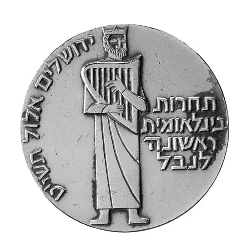 | Надписи реверса | PREMIER CONCOURS INTERNATIONAL DE HARPE נבל OFFERED PAR LE COULTER DU FESTIVAL ISRAELIEN DE HARPE JERUSALEM ISRAEL SEPTEMBER 1959 |