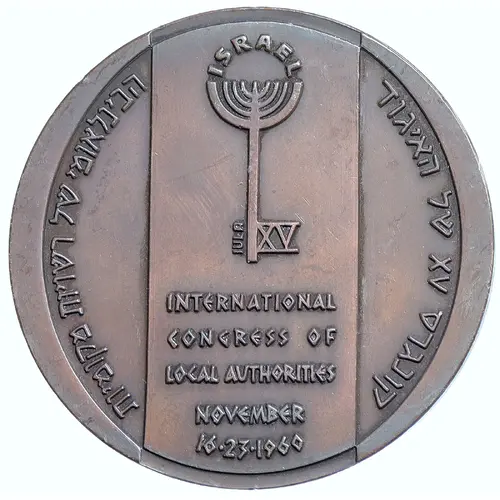 | Reverse description | In the center, above the emblem of the 15th Congress a candelabra, and the Roman numeral XV. On the side the letters `IULA`, the initials standing for `International Union of Local Authorities`. Beneath the emblem, a legend in English: `XV International Congress of Local Authorities, November 16-23, 1960`. Around, the same legend in Hebrew. |