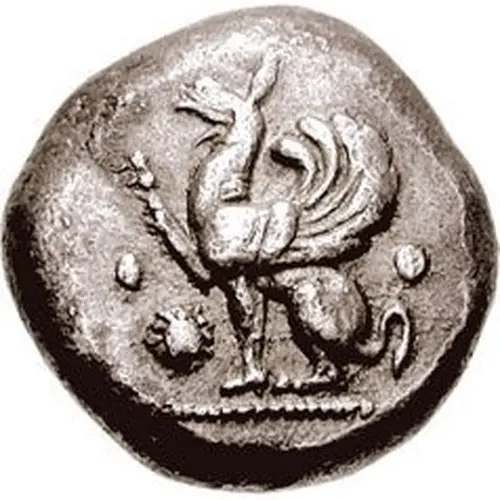 | Obverse description | Griffin seated left, right forepaw raised with pellets flanking and a rosette to the left. |