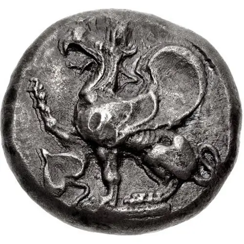 | Obverse description | Griffin seated left, raising left foreleg and an ivy leaf the the left field. |