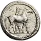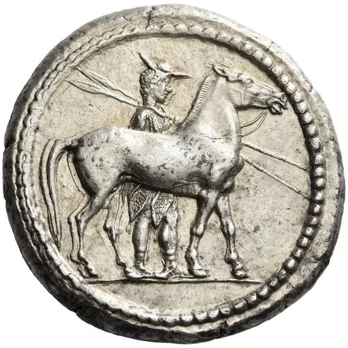 | Beschrijving voorzijde | Macedonian horseman, wearing causia and holding two spears, walking slowly to right, leading his horse. |