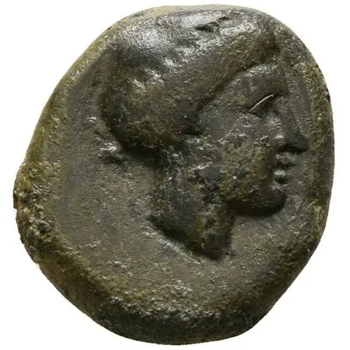 | Ön yüz açıklaması | Head of nymph, right, wearing taenia, necklace and earrings. |