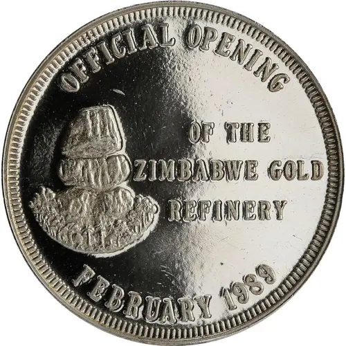 | Obverse lettering | OFFICIAL OPENING OF THE ZIMBABWE GOLD REFINERY FEBRUARY 1989 |