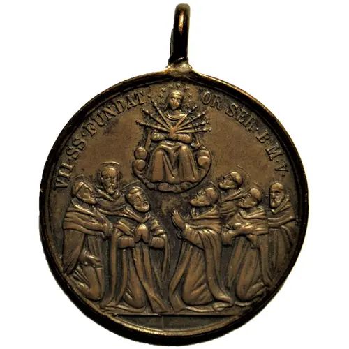 | Описание аверса | The seven founders of the Order (who became Saints) on their knees in prayer, before the Virgin Mary or Our Lady of Sorrows. (St Alexius Falconieri, St Bonifilius Monaldi, St Bonajuncta Manetti, St Bartholomaeus Degl`Amidei, St Hugh Uguccio Lippi, St Manettus dell`Antella, St Sosthenes Sostegni). |