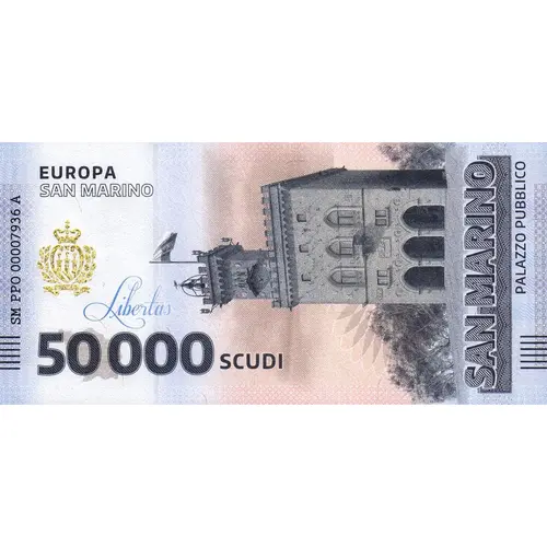 50000 SCUDI QUESTA BANCONOTA NON HA CORSO LEGALE MA È UN OGGETTO DA COLLEZIONE UFFICIALE E UN TRIBUTO ALLA PIÙ ANTICA REPUBBLICA DEL MUNDO, SAN MARINO. Libertas EUROPA (Translation: 50000 SCUDI THIS BANKNOTE IS NOT LEGAL TENDER BUT IS AN OFFICIAL COLLECTOR`S ITEM AND A TRIBUTE TO THE WORLD`S OLDEST REPUBLIC, SAN MARINO. FREEDOM EUROPE) |