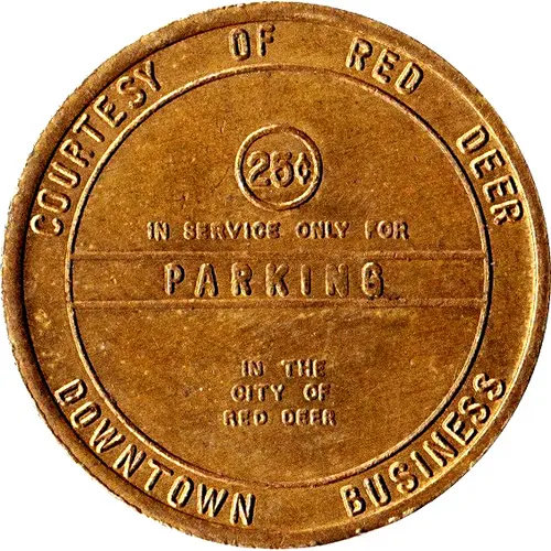 | Obverse lettering | COURTESY OF RED DEER 25C IN SERVICE ONLY FOR PARKING IN THE CITY OF RED DEER DOWNTOWN BUSINESS |