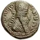 | Obverse description | A portrait of the king facing right, in Parthian-style headdress (kulah) edged along the borders with tow rows of `pearls`. There is an ornament made of `pearls` on the kulah. The central ornament is a six-pointed star. The hair covered by bashlyk edged with `pearls`, and ribbons with bows flow out from the kulah. Around his neck the King wears a necklace in the form of tow hoops. There is a pointed rim around the picture. Middle Persian (Pahlavi) legend |