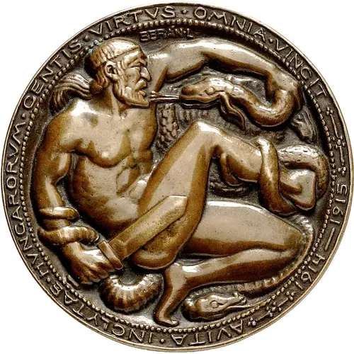 | Obverse description | Bearded nude male figure as a allegorical figure of Hungary battling with a sword a hydra. |