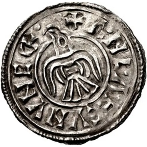 | Obverse description | Raven with wings displayed, head left, legend around. |