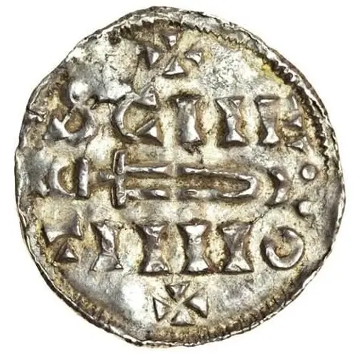 | Obverse description | Sword right, cross above and below, crescent between pellets by sword tip. |