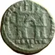 Triumphal arch with three doors, the door in the midth much higher, four figures on postaments above. The outer two are Victories holding wreath in upraised hand, the other two male figure, draped, the left holding up his right hand, the right one holding spear in his left hand. |