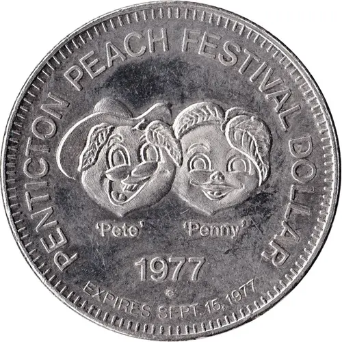 | Averslegende | PENTICTON PEACH FESTIVAL DOLLAR `Pete` `Penny` 1977 EXPIRES SEPT. 15, 1977 |