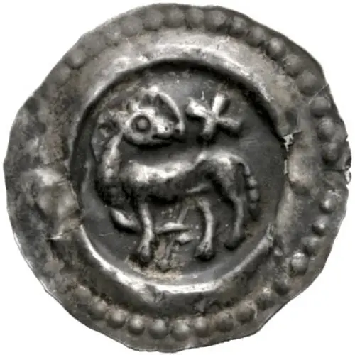 | Obverse description | Lamb with halo standing left, head right, cross behind. All within ring surrounded by pearls. |