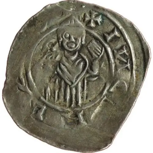 | Reverse description | Bishop`s head facing forward, above it a cross between two towers. Three dots on each side of the towers. Line and beaded circle on the outside. |