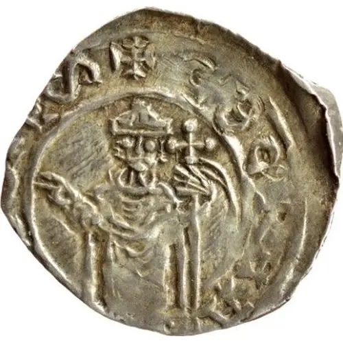 | Descrizione del dritto | Standing bishop, blessing with his right hand, holding a cross-staff in his left, from which a narrow banner hangs. Inscription around the outside in two circles. |