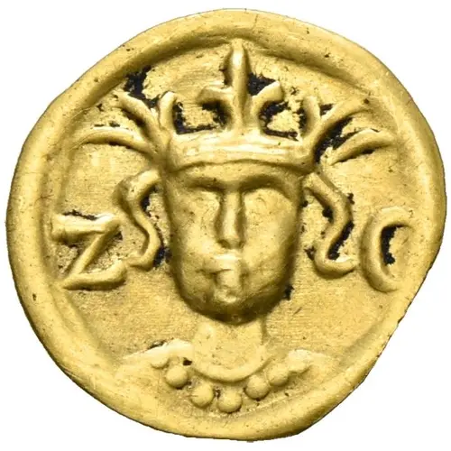 | Obverse description | Crowned facing bust wearing lilly crown, eyes as rings. |
