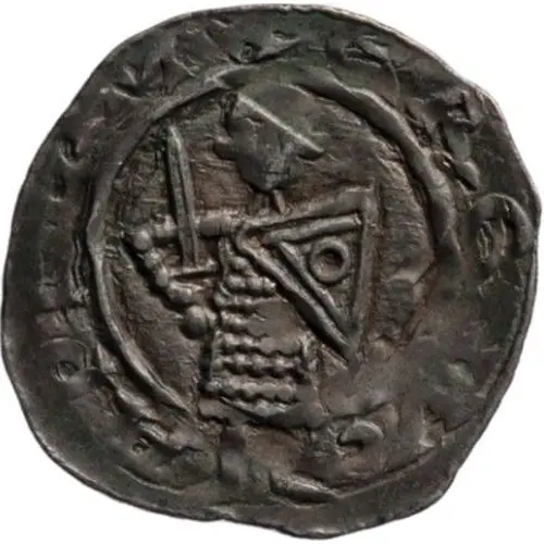 | Beschrijving voorzijde | Standing duke, frontal view, wearing chainmail, holding a sword in his right hand and a triangular shield with rings in his left. Inscription around the outside between two circular lines. |
