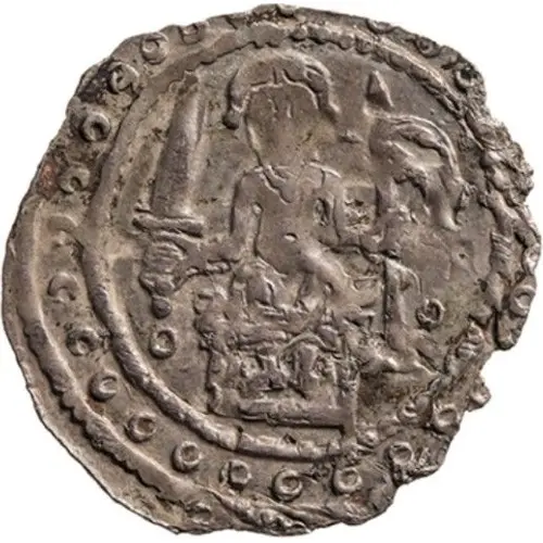 | Obverse description | A secular figure seated frontally on a throne; holding a sword in his right hand and a banner-lance in his left. A ringed border between two circles of pearls surrounds the figure. |