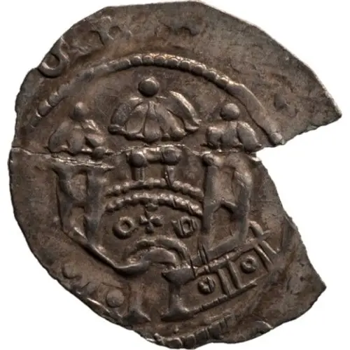 | Descrizione del dritto | Cityscape; ring wall with three towers (two on the front facade, one at the rear). Inside the wall, a small cross between two rings. Outside, a beaded circle and an Ω-shaped symbol (horseshoe). |