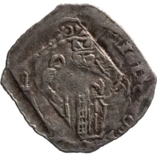 | Aversbeschreibung | Standing bishop, frontal view, with crozier in his right hand and book in his left. Inscription around the outside between two circles. |