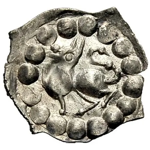 | Obverse description | Lion standing left with the mane indicated by dots and the tail raised in an `S` shape. Beaded rim. |